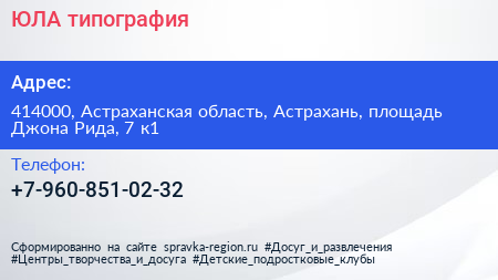 ЮЛА, типография по адресу 414000, Астраханская область, Астрахань, площадь Джона Рида, 7 к1 в дальнейшем Организация, размещена в следующих категориях: