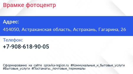 Врамке, фотоцентр по адресу 414050, Астраханская область, Астрахань, Гагарина, 26 в дальнейшем Организация, размещена в следующих категориях: