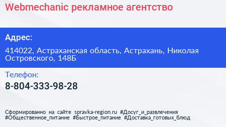 Webmechanic, рекламное агентство по адресу 414022, Астраханская область, Астрахань, Николая Островского, 148Б в дальнейшем Организация, размещена в следующих категориях: