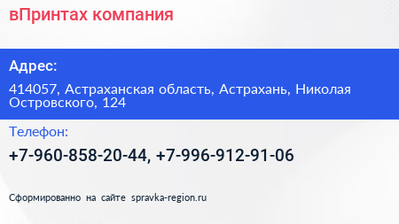 вПринтах, компания по адресу 414057, Астраханская область, Астрахань, Николая Островского, 124 в дальнейшем Организация, размещена в следующих категориях: