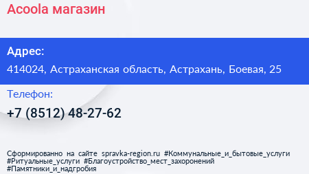 Acoola, магазин по адресу 414024, Астраханская область, Астрахань, Боевая, 25 в дальнейшем Организация, размещена в следующих категориях: