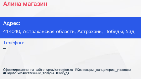 Алина, магазин по адресу 414040, Астраханская область, Астрахань, Победы, 53д в дальнейшем Организация, размещена в следующих категориях: