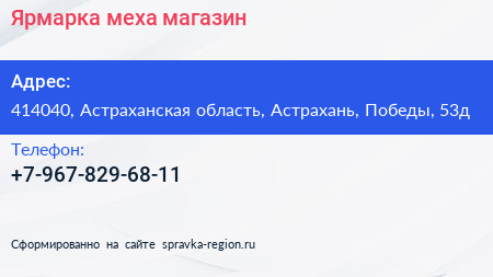 Ярмарка меха, магазин по адресу 414040, Астраханская область, Астрахань, Победы, 53д в дальнейшем Организация, размещена в следующих категориях: