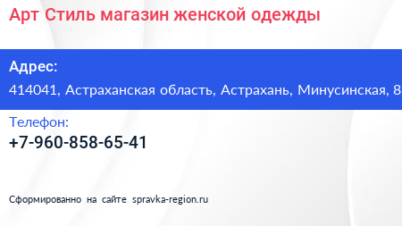 Арт Стиль, магазин женской одежды по адресу 414041, Астраханская область, Астрахань, Минусинская, 8 в дальнейшем Организация, размещена в следующих категориях: