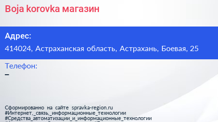 Boja korovka, магазин по адресу 414024, Астраханская область, Астрахань, Боевая, 25 в дальнейшем Организация, размещена в следующих категориях: