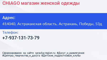 CHIAGO, магазин женской одежды по адресу 414040, Астраханская область, Астрахань, Победы, 53д в дальнейшем Организация, размещена в следующих категориях: