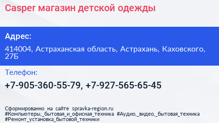Casper, магазин детской одежды по адресу 414004, Астраханская область, Астрахань, Каховского, 27Б в дальнейшем Организация, размещена в следующих категориях: