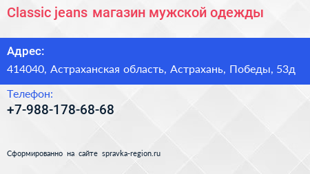 Classic jeans, магазин мужской одежды по адресу 414040, Астраханская область, Астрахань, Победы, 53д в дальнейшем Организация, размещена в следующих категориях: