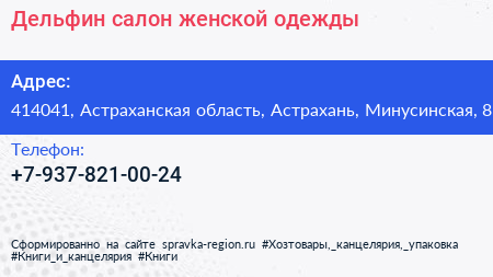 Дельфин, салон женской одежды по адресу 414041, Астраханская область, Астрахань, Минусинская, 8 в дальнейшем Организация, размещена в следующих категориях: