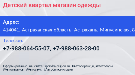 Детский квартал, магазин одежды по адресу 414041, Астраханская область, Астрахань, Минусинская, 8 в дальнейшем Организация, размещена в следующих категориях: