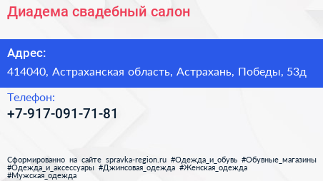 Диадема, свадебный салон по адресу 414040, Астраханская область, Астрахань, Победы, 53д в дальнейшем Организация, размещена в следующих категориях: