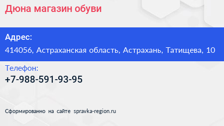 Дюна, магазин обуви по адресу 414056, Астраханская область, Астрахань, Татищева, 10 в дальнейшем Организация, размещена в следующих категориях: