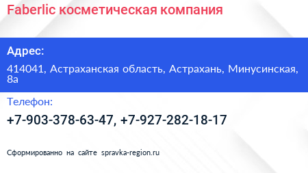 Faberlic, косметическая компания по адресу 414041, Астраханская область, Астрахань, Минусинская, 8а в дальнейшем Организация, размещена в следующих категориях: