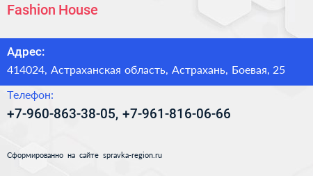 Fashion House по адресу 414024, Астраханская область, Астрахань, Боевая, 25 в дальнейшем Организация, размещена в следующих категориях: