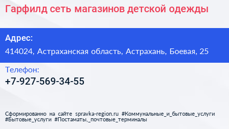 Гарфилд, сеть магазинов детской одежды по адресу 414024, Астраханская область, Астрахань, Боевая, 25 в дальнейшем Организация, размещена в следующих категориях: