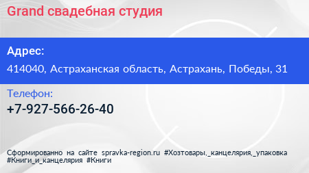 Grand, свадебная студия по адресу 414040, Астраханская область, Астрахань, Победы, 31 в дальнейшем Организация, размещена в следующих категориях:
