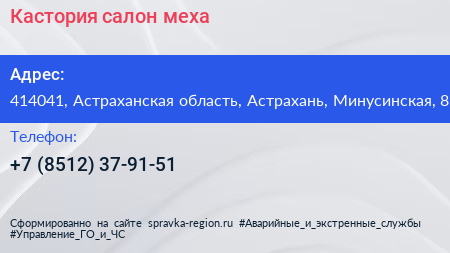 Кастория, салон меха по адресу 414041, Астраханская область, Астрахань, Минусинская, 8 в дальнейшем Организация, размещена в следующих категориях: