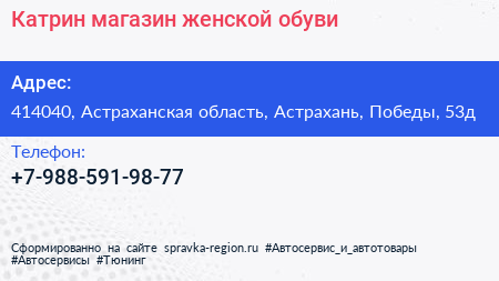 Катрин, магазин женской обуви по адресу 414040, Астраханская область, Астрахань, Победы, 53д в дальнейшем Организация, размещена в следующих категориях: