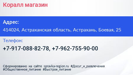 Коралл, магазин по адресу 414024, Астраханская область, Астрахань, Боевая, 25 в дальнейшем Организация, размещена в следующих категориях: