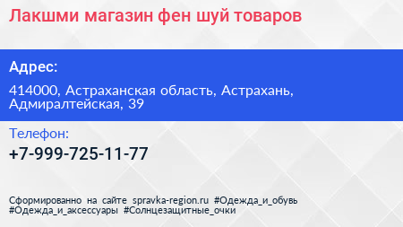 Лакшми, магазин фен-шуй товаров по адресу 414000, Астраханская область, Астрахань, Адмиралтейская, 39 в дальнейшем Организация, размещена в следующих категориях:
