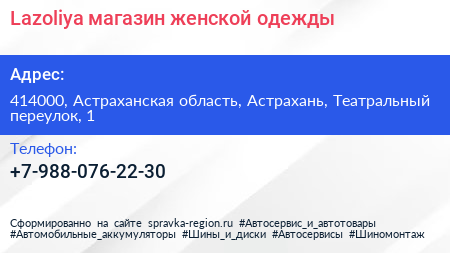 Lazoliya, магазин женской одежды по адресу 414000, Астраханская область, Астрахань, Театральный переулок, 1 в дальнейшем Организация, размещена в следующих категориях: