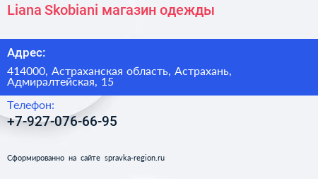 Liana Skobiani, магазин одежды по адресу 414000, Астраханская область, Астрахань, Адмиралтейская, 15 в дальнейшем Организация, размещена в следующих категориях: