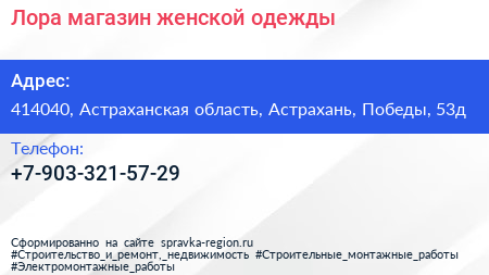 Лора, магазин женской одежды по адресу 414040, Астраханская область, Астрахань, Победы, 53д в дальнейшем Организация, размещена в следующих категориях: