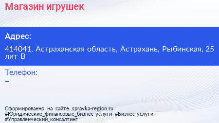 Магазин игрушек по адресу 414041, Астраханская область, Астрахань, Рыбинская, 25 лит В в дальнейшем Организация, размещена в следующих категориях: