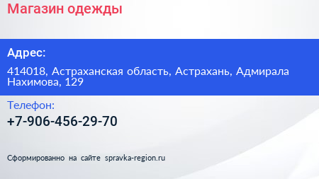 Магазин одежды по адресу 414018, Астраханская область, Астрахань, Адмирала Нахимова, 129 в дальнейшем Организация, размещена в следующих категориях: