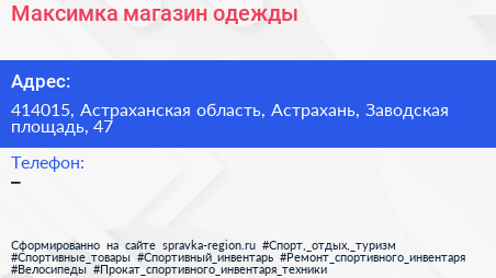 Максимка, магазин одежды по адресу 414015, Астраханская область, Астрахань, Заводская площадь, 47 в дальнейшем Организация, размещена в следующих категориях: