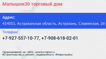Малышок30, торговый дом по адресу 414011, Астраханская область, Астрахань, Славянская, 26 в дальнейшем Организация, размещена в следующих категориях: