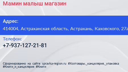 Мамин малыш, магазин по адресу 414004, Астраханская область, Астрахань, Каховского, 27а в дальнейшем Организация, размещена в следующих категориях:
