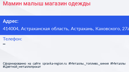 Мамин малыш, магазин одежды по адресу 414004, Астраханская область, Астрахань, Каховского, 27а в дальнейшем Организация, размещена в следующих категориях: