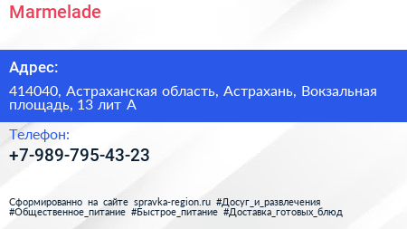 Marmelade по адресу 414040, Астраханская область, Астрахань, Вокзальная площадь, 13 лит А в дальнейшем Организация, размещена в следующих категориях: