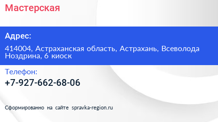 Мастерская по адресу 414004, Астраханская область, Астрахань, Всеволода Ноздрина, 6 киоск в дальнейшем Организация, размещена в следующих категориях: