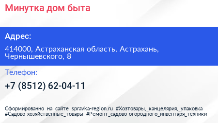 Минутка, дом быта по адресу 414000, Астраханская область, Астрахань, Чернышевского, 8 в дальнейшем Организация, размещена в следующих категориях: