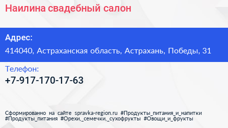 Наилина, свадебный салон по адресу 414040, Астраханская область, Астрахань, Победы, 31 в дальнейшем Организация, размещена в следующих категориях: