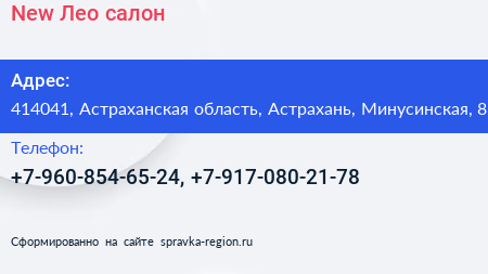 New Лео, салон по адресу 414041, Астраханская область, Астрахань, Минусинская, 8 в дальнейшем Организация, размещена в следующих категориях: