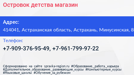 Островок детства, магазин по адресу 414041, Астраханская область, Астрахань, Минусинская, 8 в дальнейшем Организация, размещена в следующих категориях: