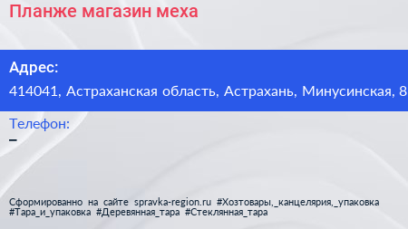 Планже, магазин меха по адресу 414041, Астраханская область, Астрахань, Минусинская, 8 в дальнейшем Организация, размещена в следующих категориях: