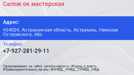 Сапож`ок, мастерская по адресу 414024, Астраханская область, Астрахань, Николая Островского, 68а в дальнейшем Организация, размещена в следующих категориях: