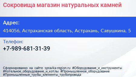 Сокровища, магазин натуральных камней по адресу 414056, Астраханская область, Астрахань, Савушкина, 5 в дальнейшем Организация, размещена в следующих категориях: