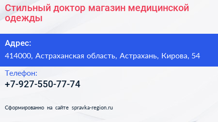 Стильный доктор, магазин медицинской одежды по адресу 414000, Астраханская область, Астрахань, Кирова, 54 в дальнейшем Организация, размещена в следующих категориях: