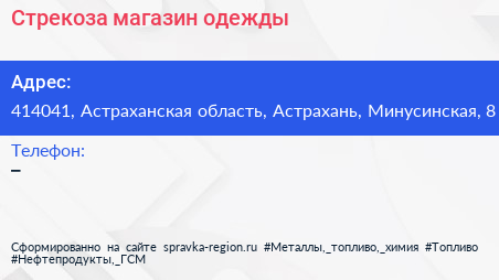 Стрекоза, магазин одежды по адресу 414041, Астраханская область, Астрахань, Минусинская, 8 в дальнейшем Организация, размещена в следующих категориях: