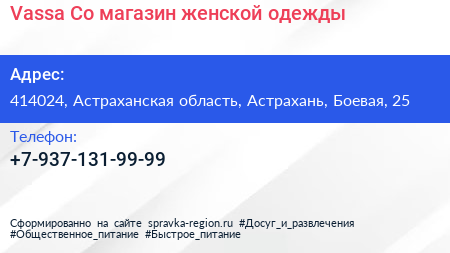 Vassa & Co, магазин женской одежды по адресу 414024, Астраханская область, Астрахань, Боевая, 25 в дальнейшем Организация, размещена в следующих категориях: