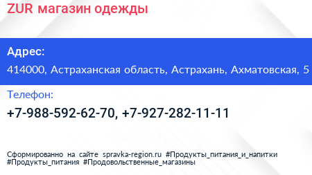 ZUR, магазин одежды по адресу 414000, Астраханская область, Астрахань, Ахматовская, 5 в дальнейшем Организация, размещена в следующих категориях: