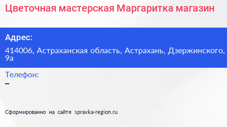 Цветочная мастерская Маргаритка, магазин по адресу 414006, Астраханская область, Астрахань, Дзержинского, 9а в дальнейшем Организация, размещена в следующих категориях: