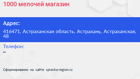 1000 мелочей, магазин по адресу 416471, Астраханская область, Астрахань, Астраханская, 48 в дальнейшем Организация, размещена в следующих категориях: