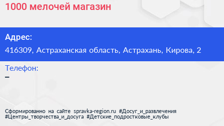 1000 мелочей, магазин по адресу 416309, Астраханская область, Астрахань, Кирова, 2 в дальнейшем Организация, размещена в следующих категориях: