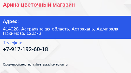 Арина, цветочный магазин по адресу 414028, Астраханская область, Астрахань, Адмирала Нахимова, 122а/3 в дальнейшем Организация, размещена в следующих категориях: